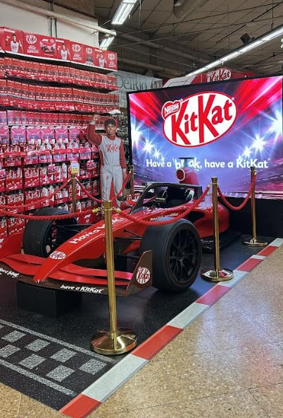 O espaço temático conta com um carro de Fórmula 1 em tamanho real e uma pista adesivada no chão que guiará os clientes até os chocolates KitKat