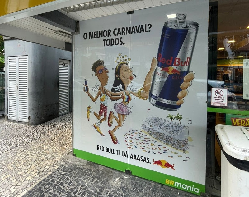 Já com a Red Bull, a rede implantou uma loja emblemática na unidade da Rua Rui Barbosa, no Flamengo, transformando o espaço em um circuito temático de Carnaval. A ativação inclui adesivos de chão que guiam o consumidor, gôndolas e geladeiras exclusivas, além de uma cabine de glitter instagramável, ambientação de fachada e vitrines, reforçando a experiência imersiva no PDV.