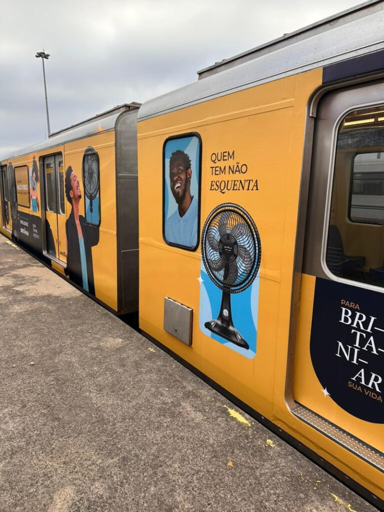 Para reforçar sua presença nacional e evidenciar os diferenciais da linha de ventilação, a Britânia adesivou um trem completo do metrô, com mais de 80 metros de extensão, além de um vagão interno totalmente ambientado. A proposta é convidar o público paulistano a embarcar em uma experiência marcada pelo bom humor e pela sensação de frescor, transformando o trajeto diário em um momento de conexão com a marca.