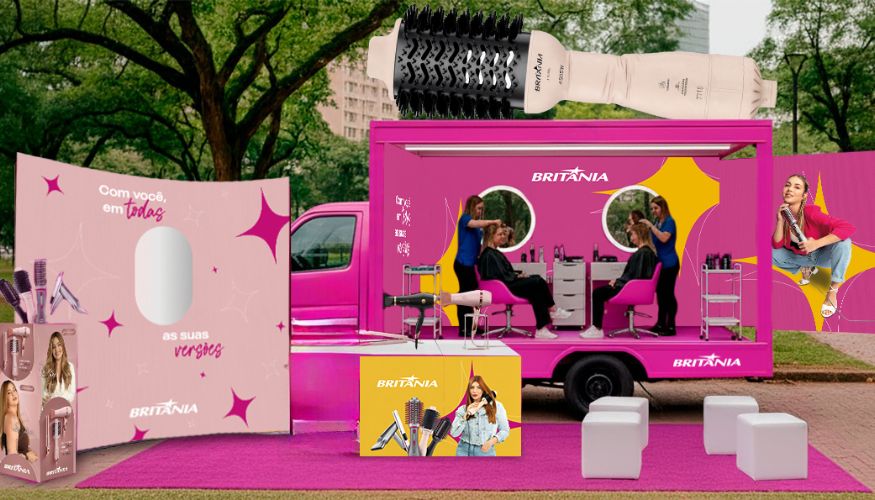 O caminhão temático leva para as ruas a identidade visual da linha de escovas secadoras Britânia e reúne diversos produtos que combinam tecnologia, praticidade e resultados profissionais.