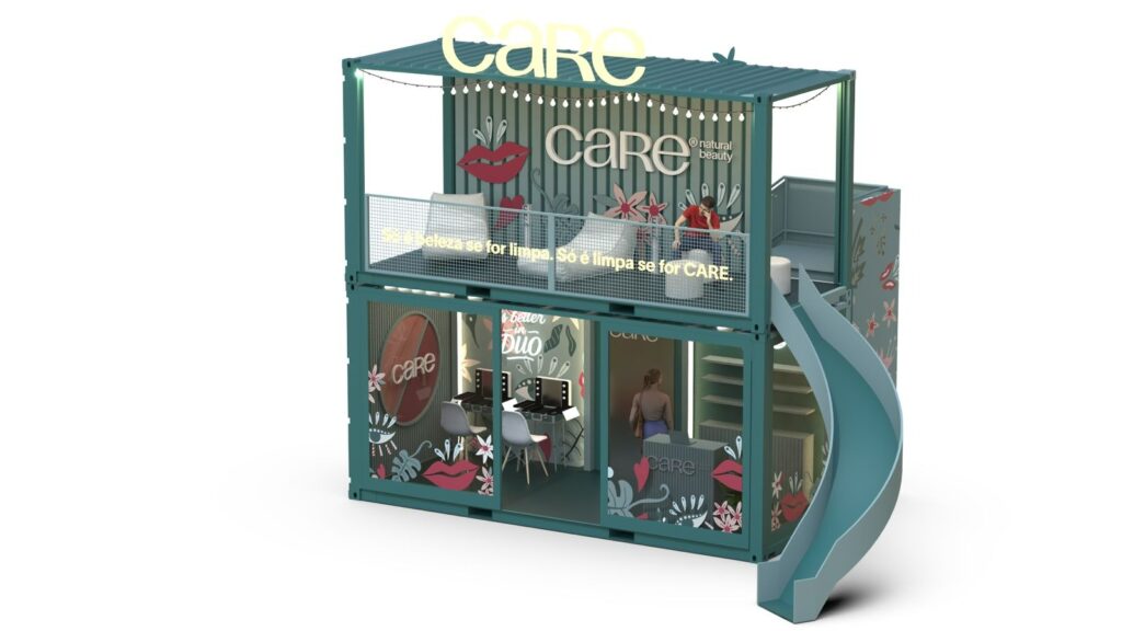 Instalado em um contêiner de dois andares, o espaço de autocuidado combina beleza e bem-estar: no piso térreo, os visitantes podem retocar a maquiagem, experimentar e adquirir produtos da CARE em um clima descontraído; no andar superior, há um espaço para relaxar, recarregar o celular e recuperar as energias. O espaço ainda conta com um escorregador, reforçando o caráter divertido e acolhedor da ativação.