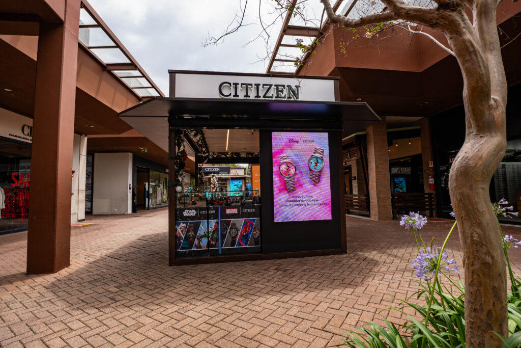 Para marcar a estreia, a Citizen apostou em uma experiência de compra imersiva. O quiosque foi totalmente ambientado com elementos visuais do universo Disney, criando um espaço pensado para despertar conexão emocional com personagens clássicos e transformar o momento da compra em uma experiência lúdica e memorável.