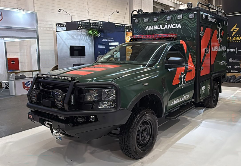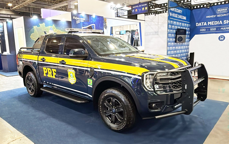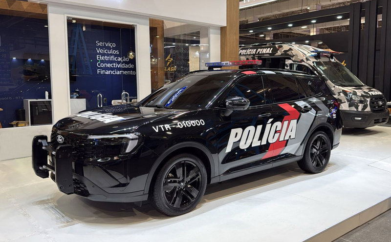 Entre os modelos expostos estão duas vans Transit — uma adaptada pela Engesig para escolta de detentos com capacidade para 8 presos, 4 escoltas e 2 acompanhantes, e outra equipada com plataforma elevada de observação, assinada pela Flash. As picapes Ranger 2.0 também marcam presença: uma XL, de cabine simples, tração 4×4 e baú de 8,7 m³, convertida em ambulância pela Raytec; e uma XLS, de cabine dupla, preparada para patrulhamento pela Flash. Já o SUV Territory aparece em duas versões de viatura policial com cela para detidos, fruto das parcerias com Raytec e Flash.