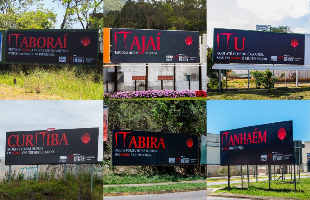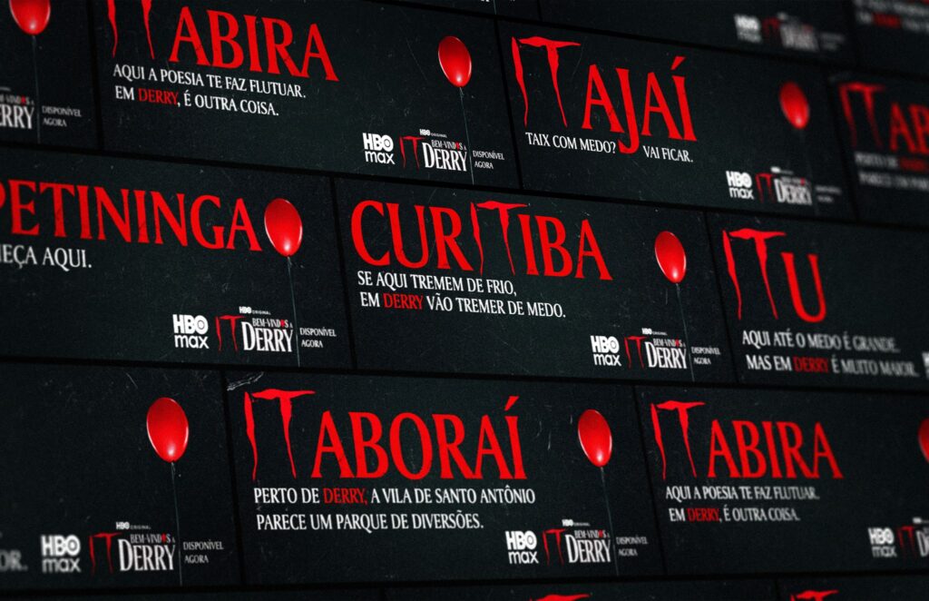 A HBO Max intensificou a divulgação da série IT: Bem-Vindos a Derry com uma estratégia OOH criativo que chamou atenção em diferentes regiões do Brasil. A campanha explorou, de forma inteligente, nomes de cidades que carregam o “IT” na grafia — como Itabira, Itu, Itajaí e Curitiba — para aproximar o universo do terror da rotina urbana.