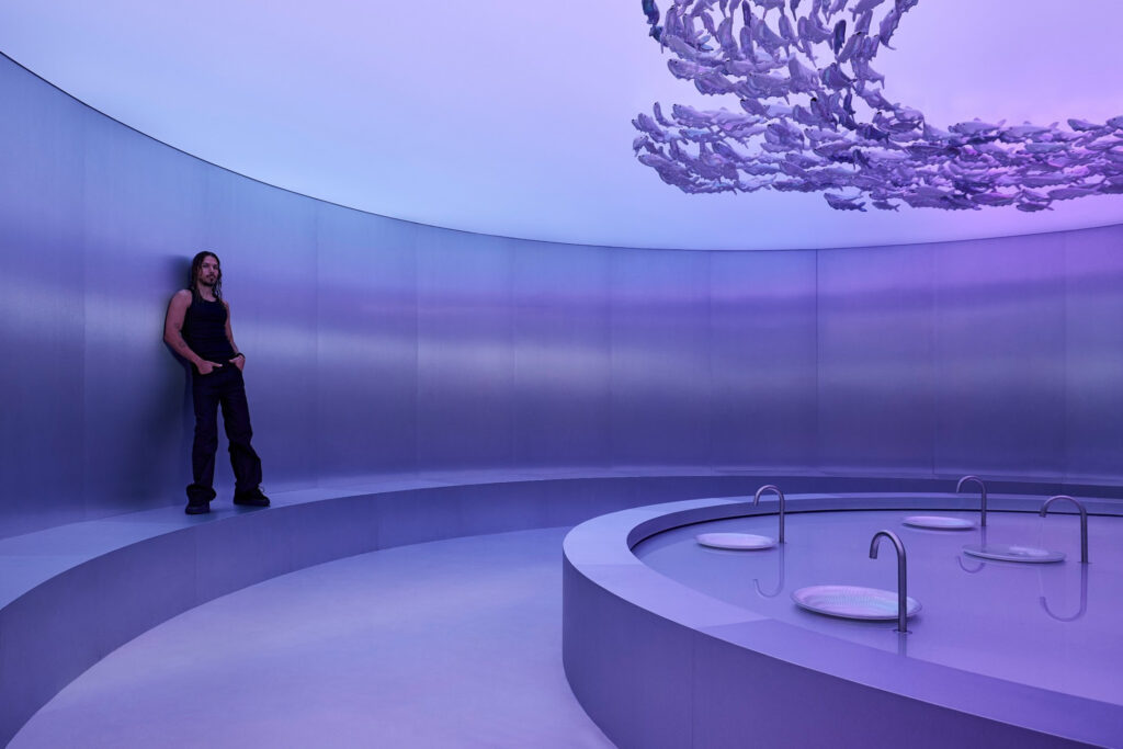 Para traduzir essa narrativa em experiência, a Kohler convidou Harry Nuriev, fundador e diretor criativo do Crosby Studios, para assinar uma instalação imersiva apresentada na Design Miami, em sintonia com o tema da edição 2025, Make.Believe. Conhecido por borrar fronteiras entre arte, arquitetura e design sensorial, Nuriev transformou o Pearlized em um ambiente onírico, onde superfícies ondulam, refletem luz e se transformam conforme o movimento do visitante.