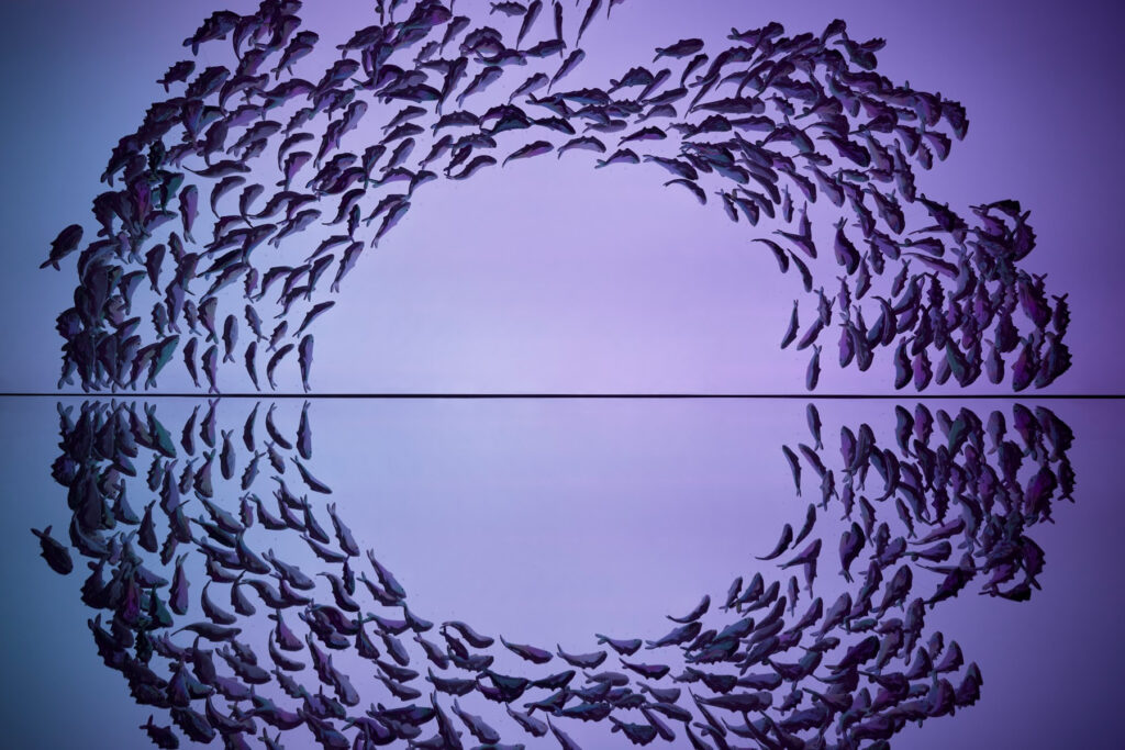 Foi justamente nesse ambiente, onde os processos industriais se abrem ao risco criativo, que surgiu a virada do projeto. Durante a criação da obra Once and Forever Lake Michigan — uma escultura formada por 1.600 peixes de cerâmica, hoje em exibição permanente no Shedd Aquarium, em Chicago — Franklin e a equipe de engenharia da Kohler decidiram testar uma ideia pouco convencional: aplicar a tecnologia PVD, tradicionalmente utilizada em metais, diretamente sobre a cerâmica.