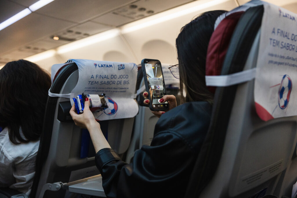 Em parceria com a BIS, a ação começou bem antes do apito inicial. No voo LA3018, que partiu de Congonhas com destino a Brasília às 20h30, os passageiros foram surpreendidos com uma experiência digna de arquibancada. Enquanto Palmeiras e Novorizontino se enfrentavam no interior paulista, quem estava a bordo pôde acompanhar o jogo ao vivo pelo YouTube, com Wi-Fi liberado, e ainda foi brindado com chocolates BIS Xtra em uma dinâmica inspirada no serviço de bordo. Teve até sorteio de ingressos para o camarote da marca no MorumBIS.
