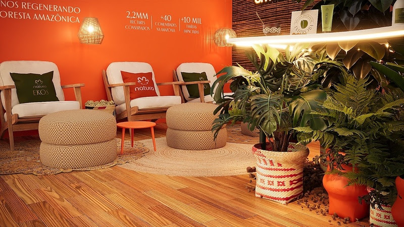 O ambiente da Natura conta com uma identidade visual vibrante, composta por elementos naturais e uma parede cênica feita de sabonetes Ekos, criando um cenário ideal para fotos e momentos de conexão com a marca.