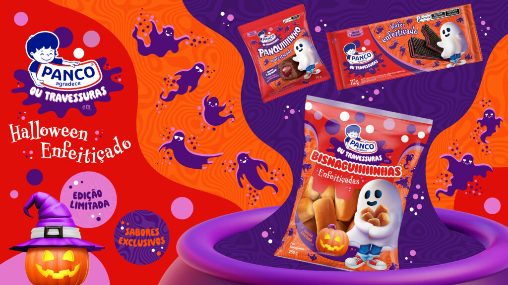 A comunicação da campanha traz uma linguagem leve e afetiva, traduzida em um key visual temático que aparece nas embalagens e em todas as peças publicitárias. A estética une o clima do Halloween à identidade acolhedora e divertida da Panco.