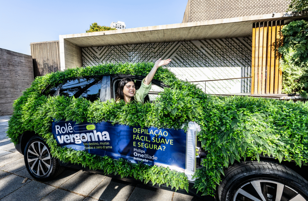 Antes de chegarem ao local, foram surpreendidos com um “carro moita”, veículo customizado com folhagens, que levou os convidados para um passeio divertido pela cidade, reforçando a proposta da Philips de tratar o tema sem filtro e de forma descontraída.