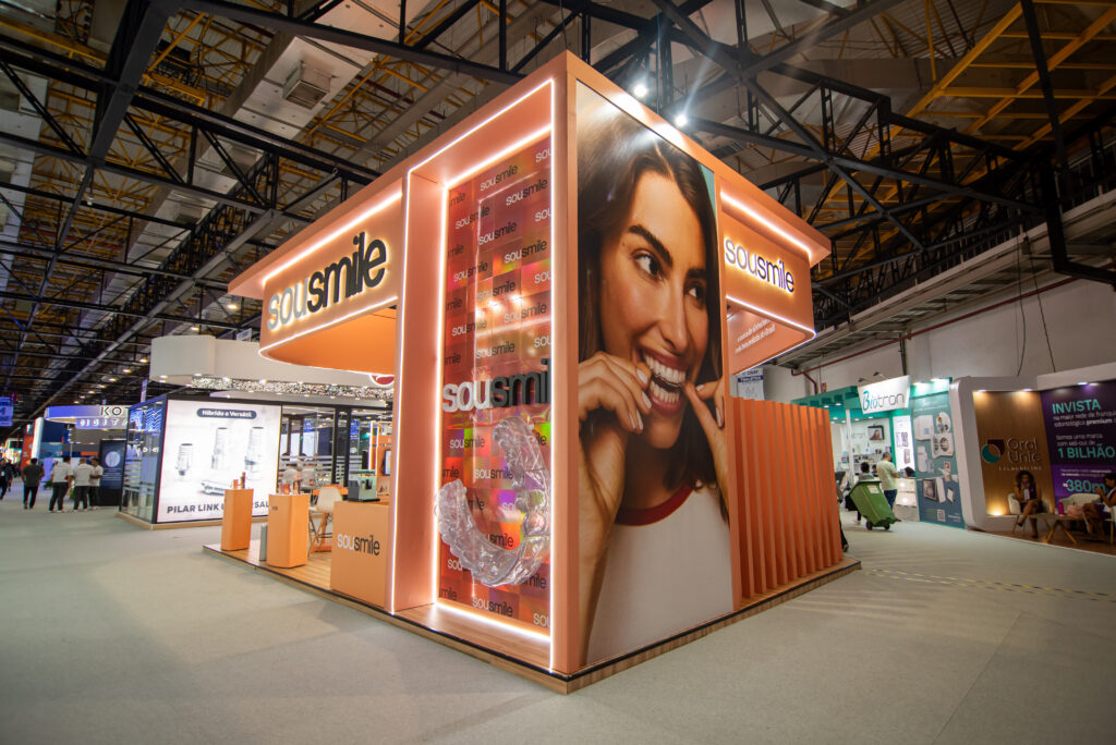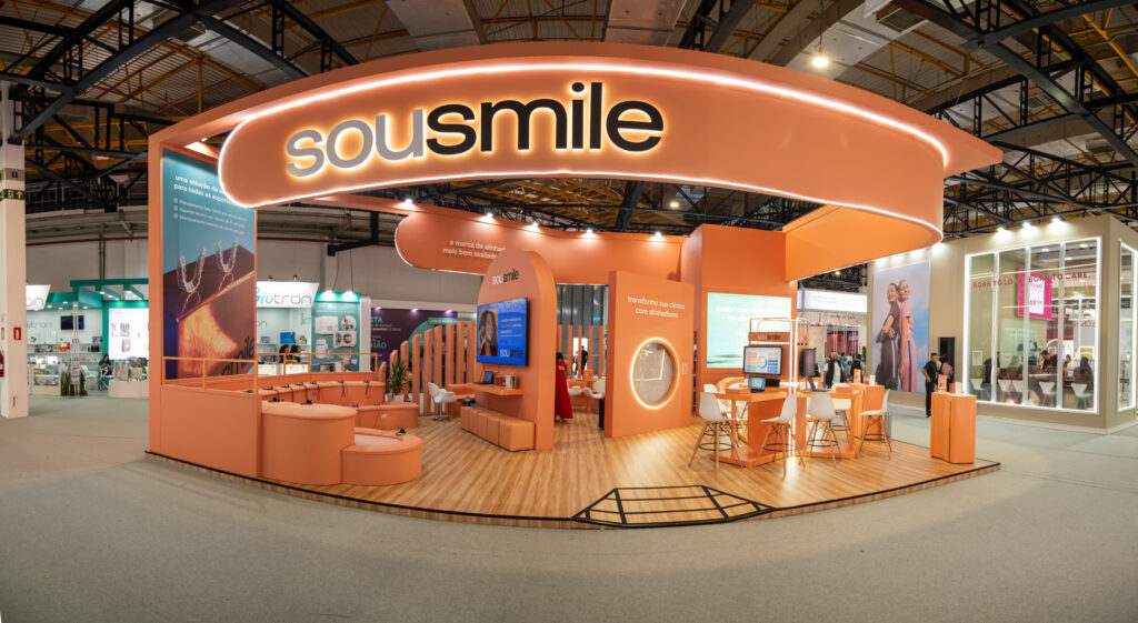 Com formas convidativas e uma arquitetura aberta, sem barreiras físicas, o estande foi pensado para estimular a aproximação do público e reforçar o posicionamento da SouSmile como uma marca acessível e acolhedora. O layout privilegiou a fluidez na circulação, o conforto e a facilidade de acesso, tornando o espaço naturalmente atrativo em meio à dinâmica intensa do pavilhão.