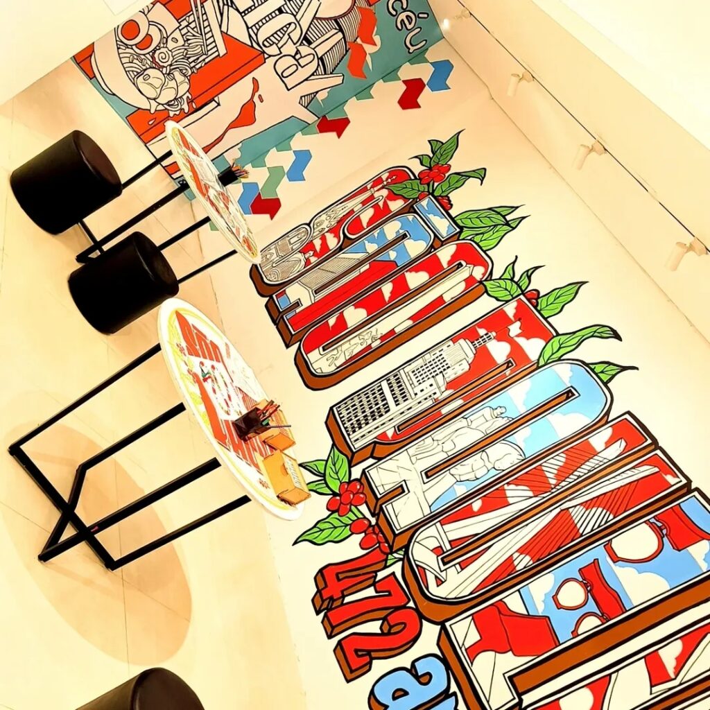 Murais ilustrados retratam pontos turísticos icônicos da cidade. Além disso, destacam gírias populares e sabores tradicionais que representam São Paulo. Entre eles, aparecem o cafezinho, a pizza e o clássico pão com mortadela.