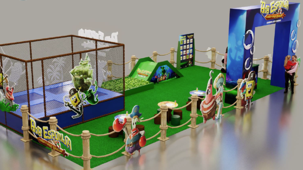 O espaço infantil temático do Bob Esponja foi pensado para estimular a imaginação e o movimento dos pequenos, reunindo um circuito interativo com cama elástica, piscina de bolinhas com escorrega, jogo da memória e mesas de atividades inspiradas nos personagens da famosa animação.