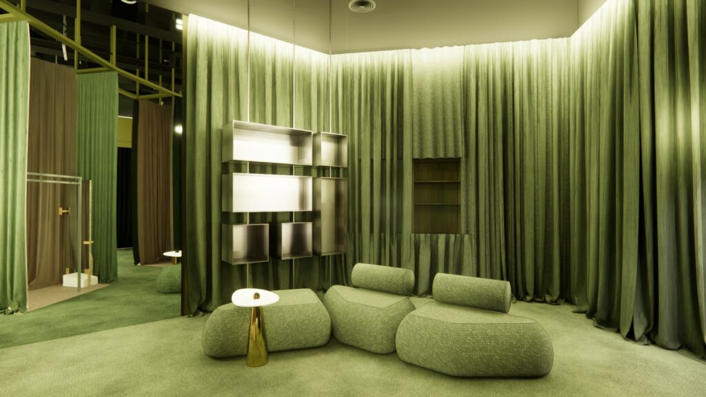 Assinado pela arquiteta Renata Gaia, responsável pelo projeto arquitetônico da Shoulder, o ambiente aposta em uma leitura sensorial do conceito Roupa boa. Tecidos, texturas e cortinas criam camadas de conforto e acolhimento, integrando os espaços em uma mesma atmosfera contínua, pensada para desacelerar o tempo e estimular a experimentação.