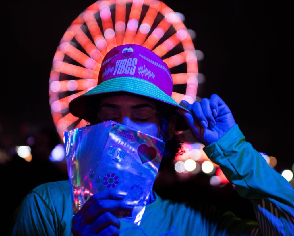 No The Town 2025, a Amstel Vibes, bebida ready to drink do Grupo HEINEKEN, promove uma ativação no gramado do festival. Mochileiros circulam entre o público oferecendo os sabores limão e strawmelon (morango com melancia), vestidos com uniformes coloridos e tecidos que brilham no escuro para se destacarem.