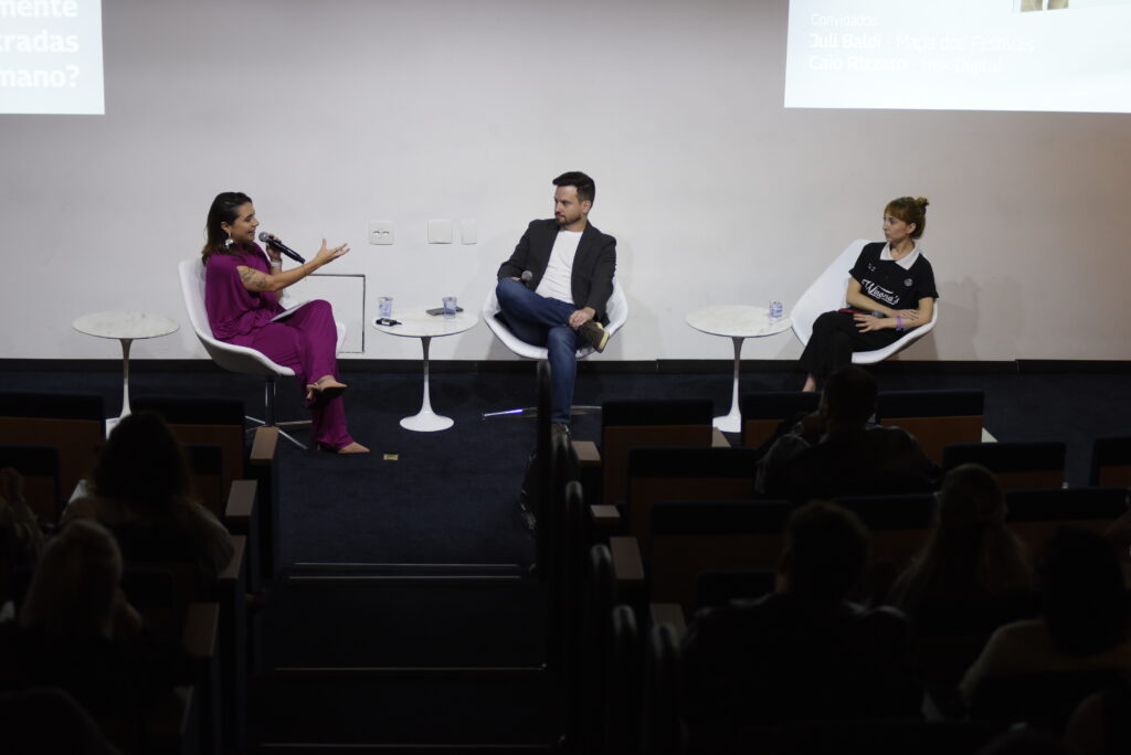 Na sequência, o painel com Caio Rizzato (Nex Lab) e Juli Baldi (Mapa dos Festivais / Bananas Music) trouxe uma provocação central: em um mercado cada vez mais tecnológico, como fazer experiências realmente centradas no humano?