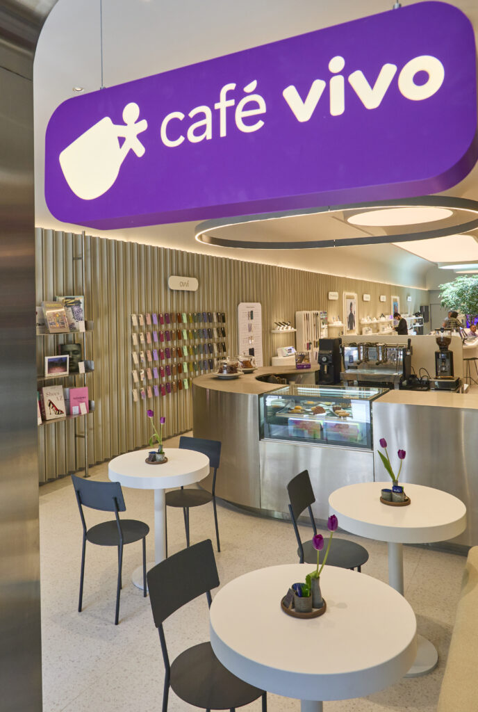 Com 260m², o projeto arquitetônico assinado por Martin Corullon e Gustavo Cedroni, do Metro Arquitetos, apresenta um design minimalista e fluido, inspirado nas linhas orgânicas do Vivinho, mascote da marca. O espaço foi concebido como uma jornada sensorial e intuitiva, integrando um café, uma livraria e uma instalação artística.
