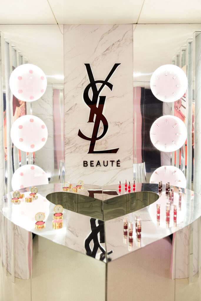 - The Love Palette: espaço dedicado aos lançamentos, como o YSL Loveshine Plumping Gloss e o Make Me Blush Powder, que combinam tratamento e performance.